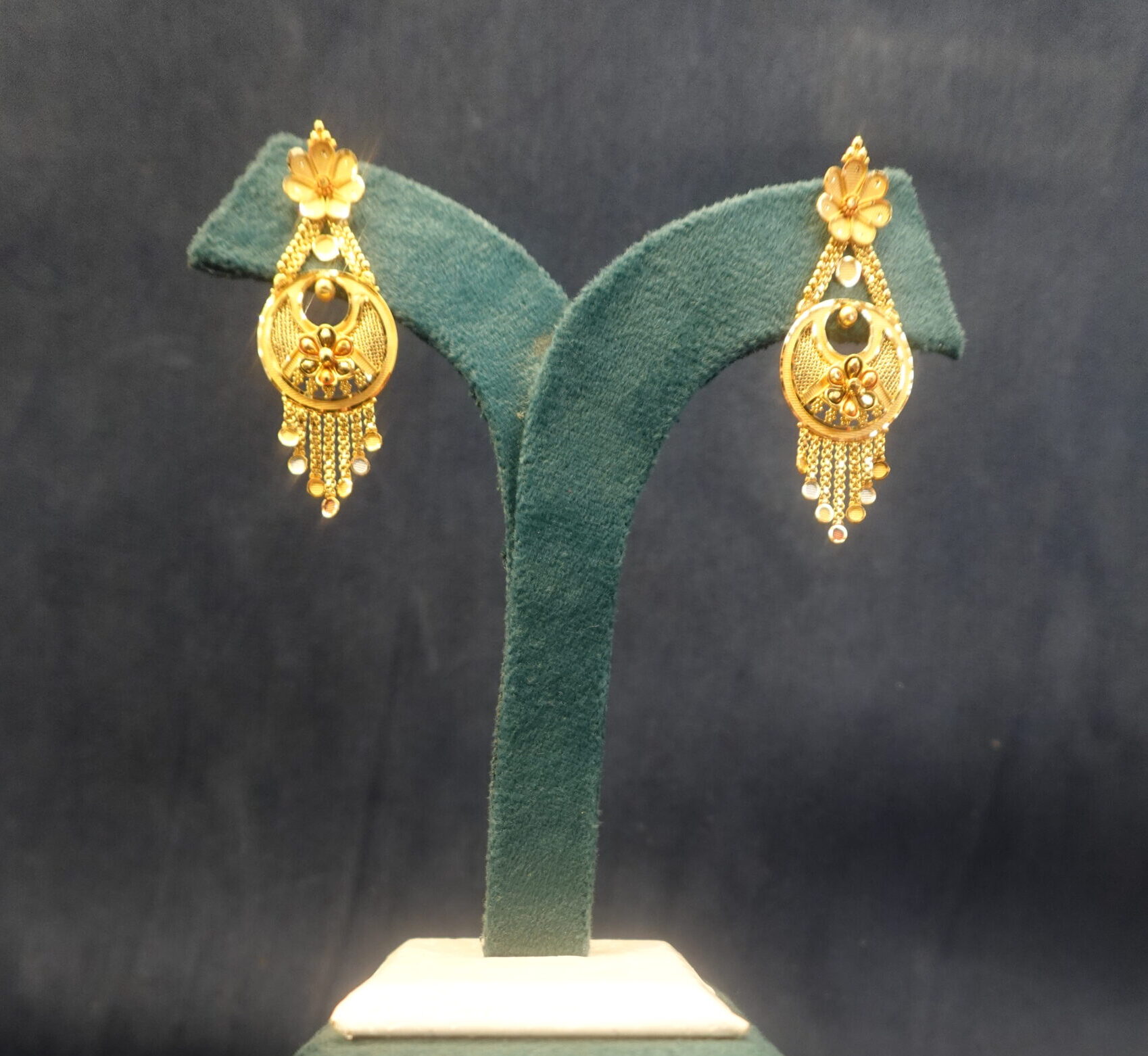 Introducing the Antique Floral Drop Earrings from the Gold Elegance Collection by Surya Abhushan Kendra — a symbol of timeless artistry and traditional charm. These exquisite earrings feature a delicate floral top, a circular motif centerpiece adorned with fine filigree, and elegant chain-like tassels that move with grace. Each element is thoughtfully designed to bring out your inner diva during festive events, weddings, or cultural celebrations. Crafted with a radiant gold finish, they promise to enhance your ethnic ensemble with sophistication and poise.